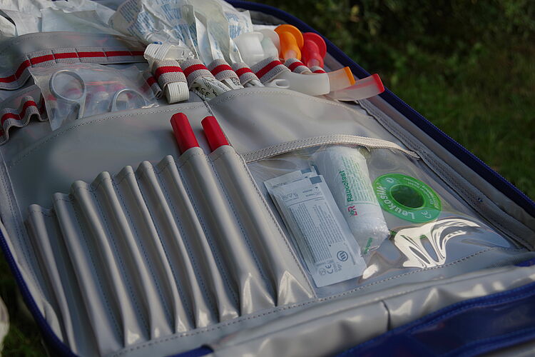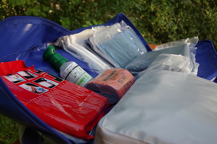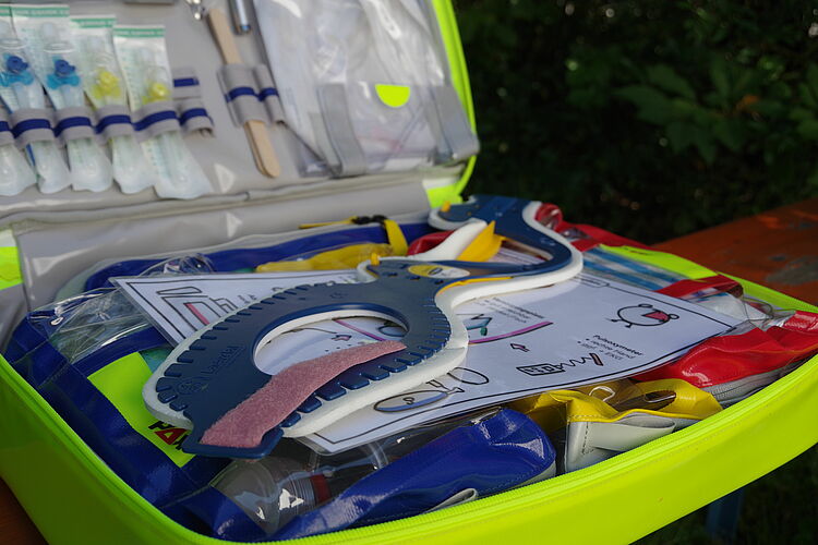 Damit wir im Notfall auch für die Kleinsten da sein können gehört unsere Kindernotfalltasche zum festen Inventar des Fahrzeuges. Hier finden sich alle wichtigen Materialien in Kindergröße. Zudem einige Merkhilfen zum Thema Kindernotfall und natürlich das wichtigste: ein kleiner Kuscheltier Dino als Mutmacher!