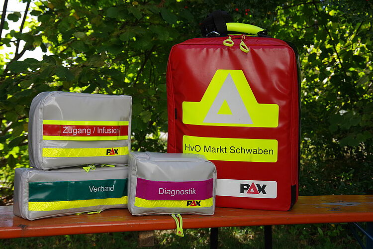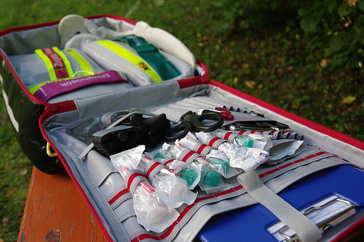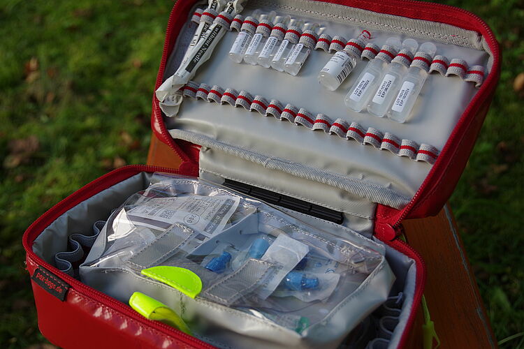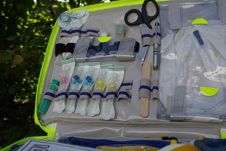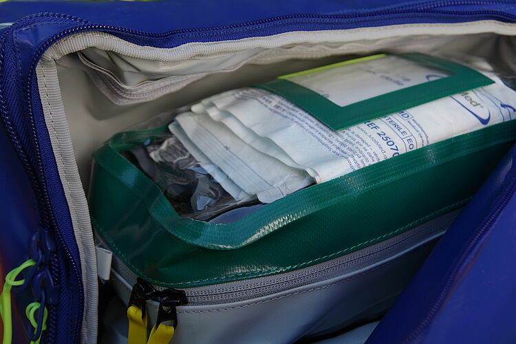 Unser HvO ist mit dem sog. Zweirucksack System ausgestattet, das bedeutet, dass das gesamte medizinische Material in zwei Rucksäcke unterteilt ist. Im roten Rucksack - auch “Kreislauf Rucksack” genannt - ist das gesamte Material zum Behandlen von Kreislauferkrankungen oder auch Verletzungen im Allgemeinen zu finden. So z.B. ein Infusionsset zur intravenösen Flüssigkeitsgabe, Verbandsmaterial oder Diagnostik (Blutdruckmanschette, Stethoskop, Fieberthermometer etc.).