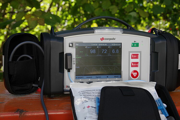 Zur Überwachung der wichtigsten Vitalparameter und als Defibrillator dient uns im HvO unser “Corpuls 1”. Dieses Gerät ist für den HvO Dienst als kleiner “Allrounder” der perfekte Begleiter: so können wir bereits vor Eintreffen des Rettungsdienstes ein kleines EKG kleben und Herzfrequenz, Sauerstoffsättigung und Puls überwachen. Bei einer Reanimation dient uns das Gerät als Defibrillator mit automatischem und manuellen Modus.