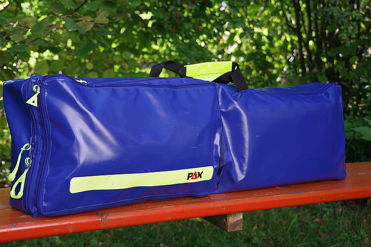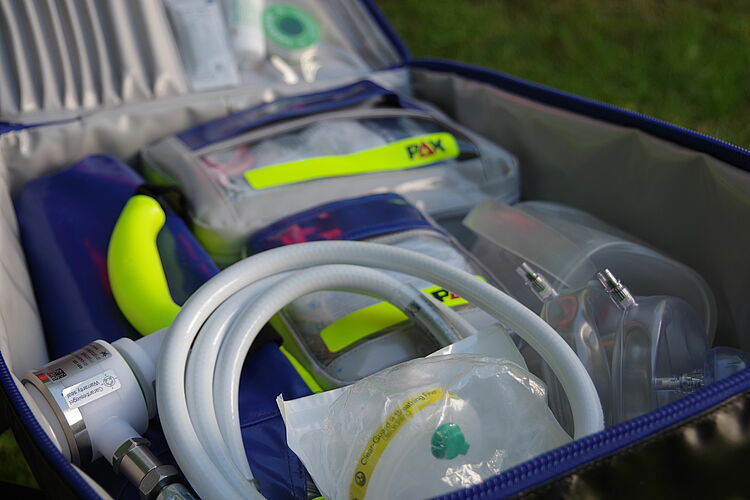 Der blaue Notfallrucksack - oder auch (Be-)Atmungsrucksack - beihaltet alle Materialien, die bei Atemstörungen/ Atemproblemen wichtig sind. So z.B. eine 2l Sauerstoffflasche inkl. Zubehör, Beamtungsbeutel mit Demandventil, Supraglottische Atemwegshilfen (zur Anwendung als Intubation bei Reanimationen) oder einer manuellen Absaugpumpe.